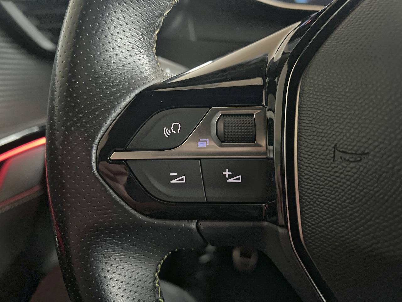 • Volant compact cuir fleur avec laçage vert, Lion chromé et badge GT et commandes multimédia sur volant